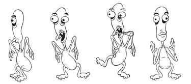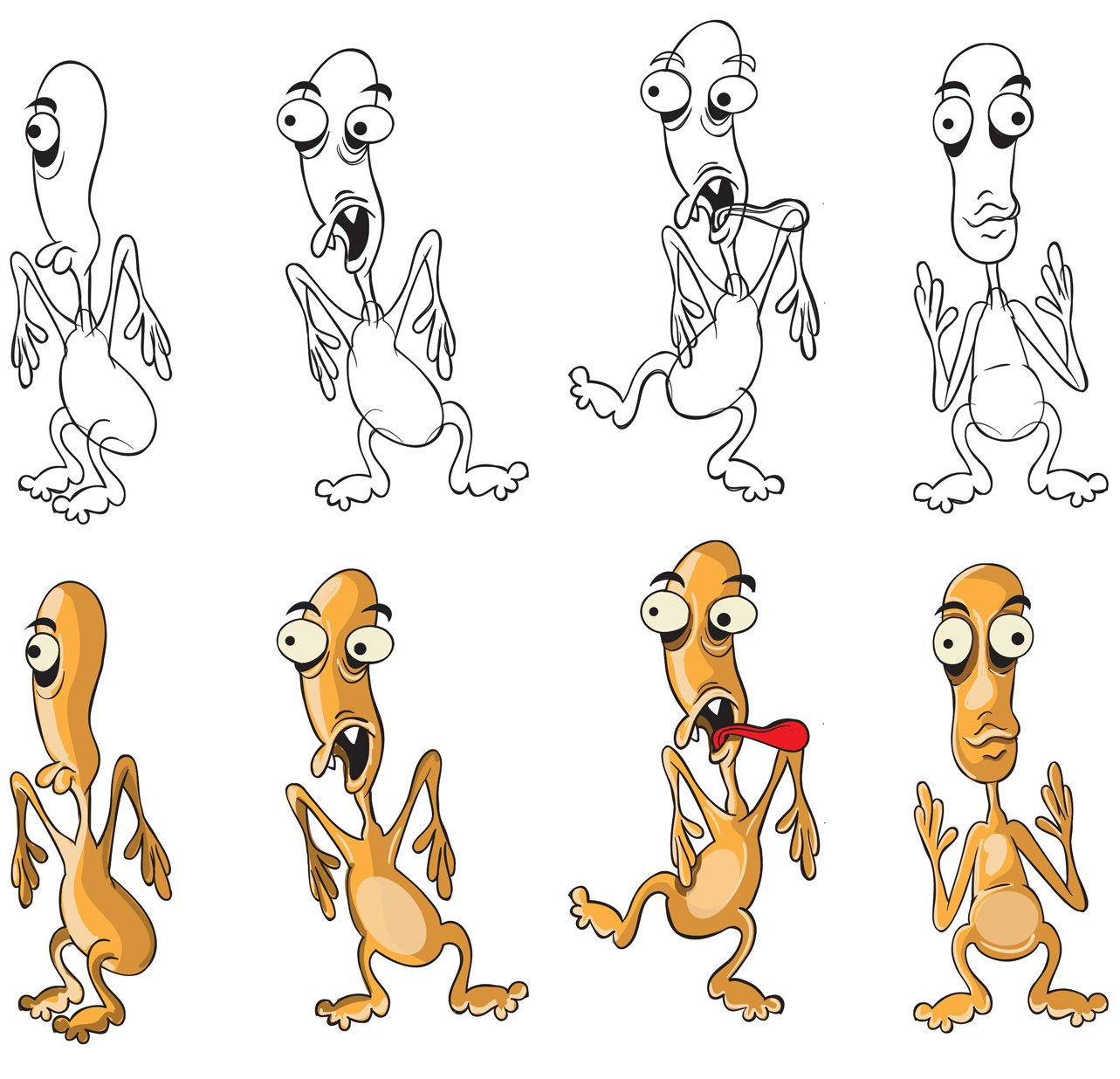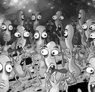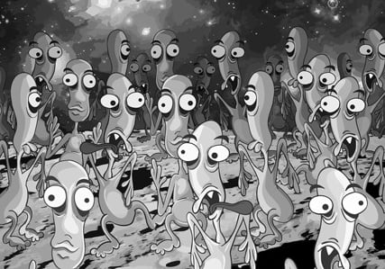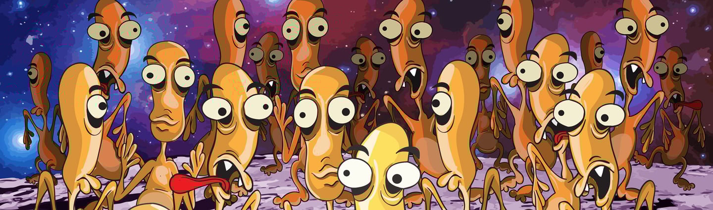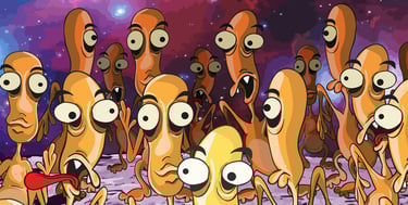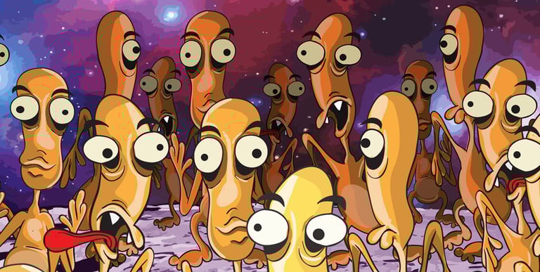 This surreal, cartoon-style illustration was crafted using precise vector art techniques, allowing for crisp lines, vibrant colours, and smooth, scalable details. The chaotic space scene bursts with energy as a group of small, orange, humanoid creatures interact in wide-eyed amazement, their exaggerated features enhanced by the clean, polished look of vector rendering.