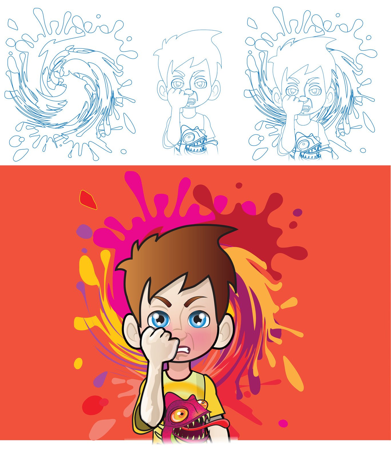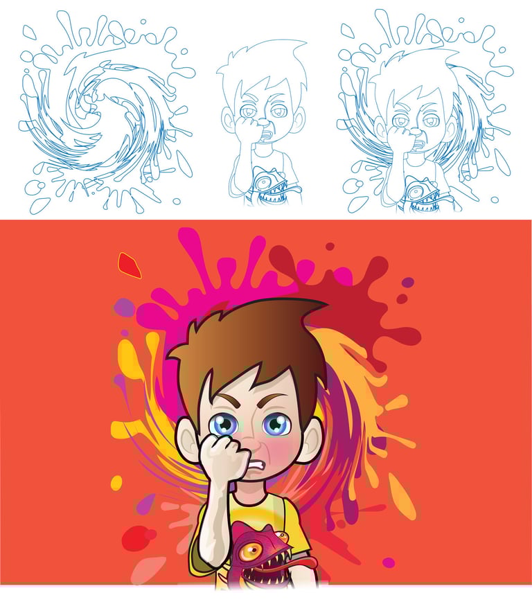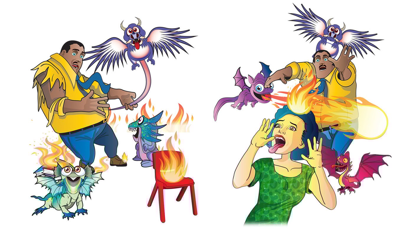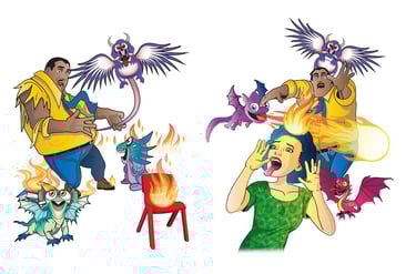 The story follows Jeremy, a boy whose anger manifests into chaotic fire-breathing dragons and mischievous hyenas, wreaking havoc in the classroom. Through expressive and dynamic illustrations, I brought Jeremy’s journey to life, visually capturing the transformation from frustration to self-control.