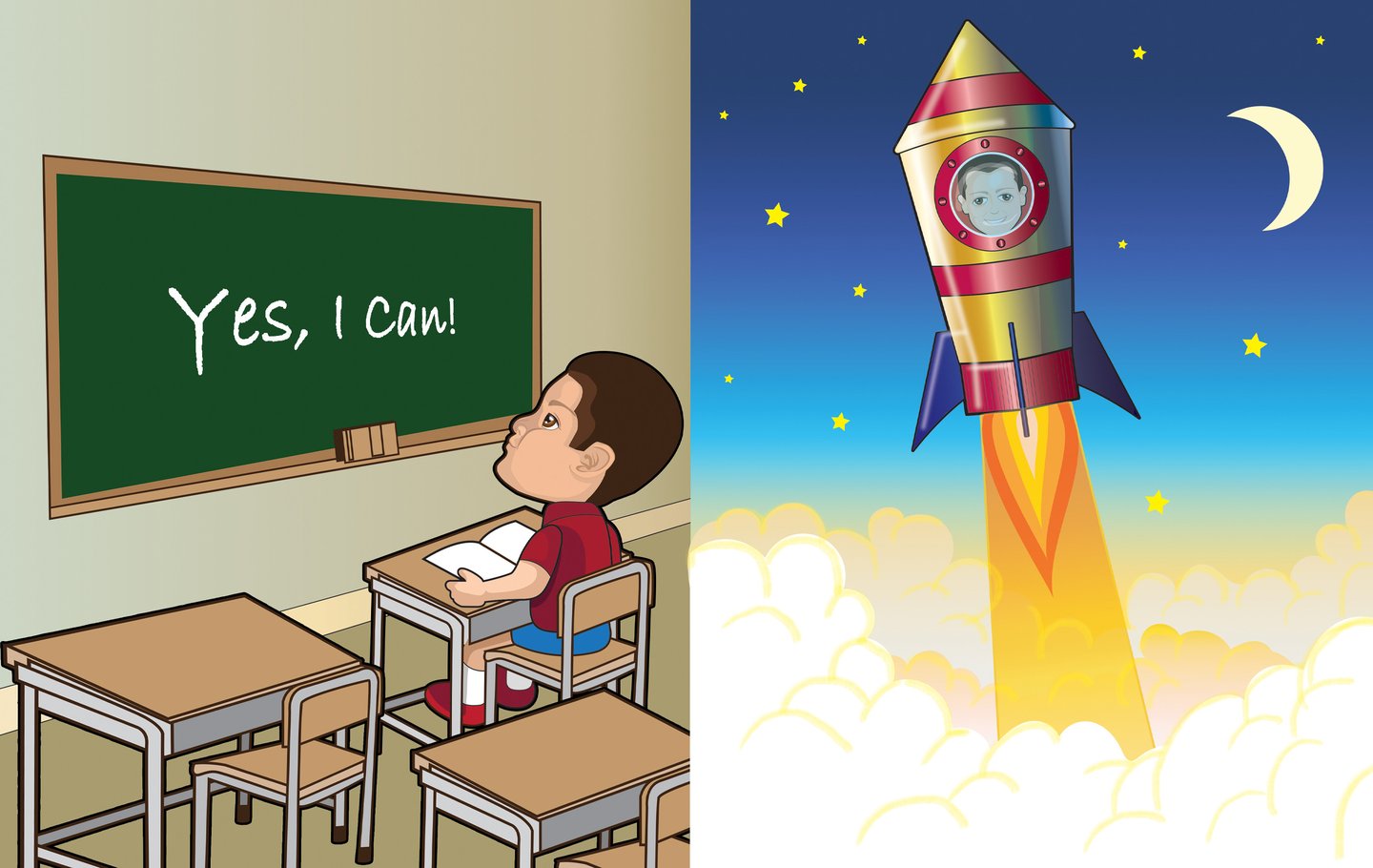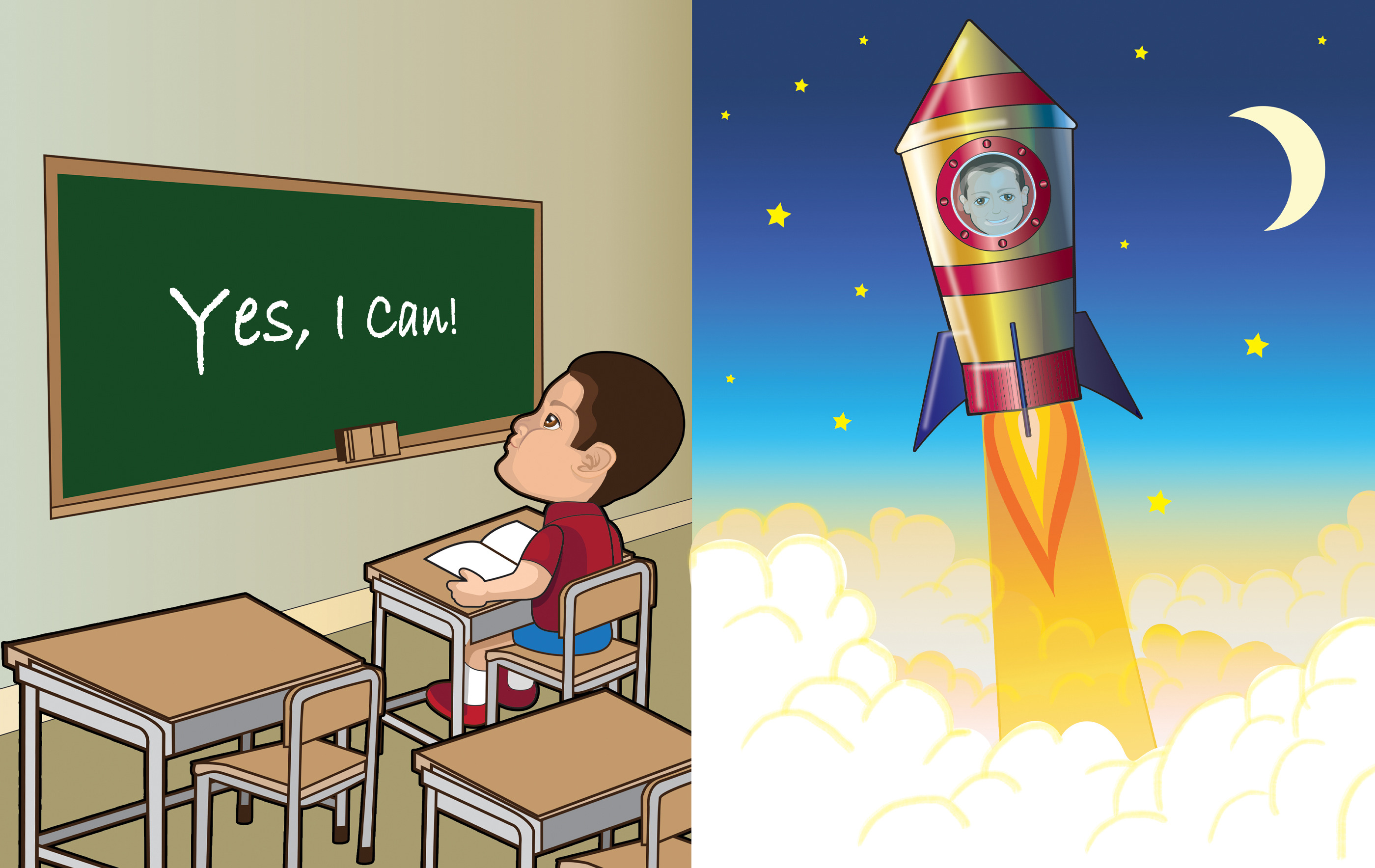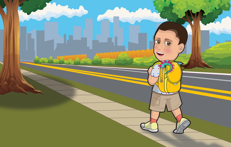 Using my personal vector-art style, I transformed the real-life boy into a charming, cartooned character, ensuring his features remained expressive and engaging. Vector art allowed me to construct scenes efficiently, while a bright colour palette helped define the book’s energetic and magical atmosphere.