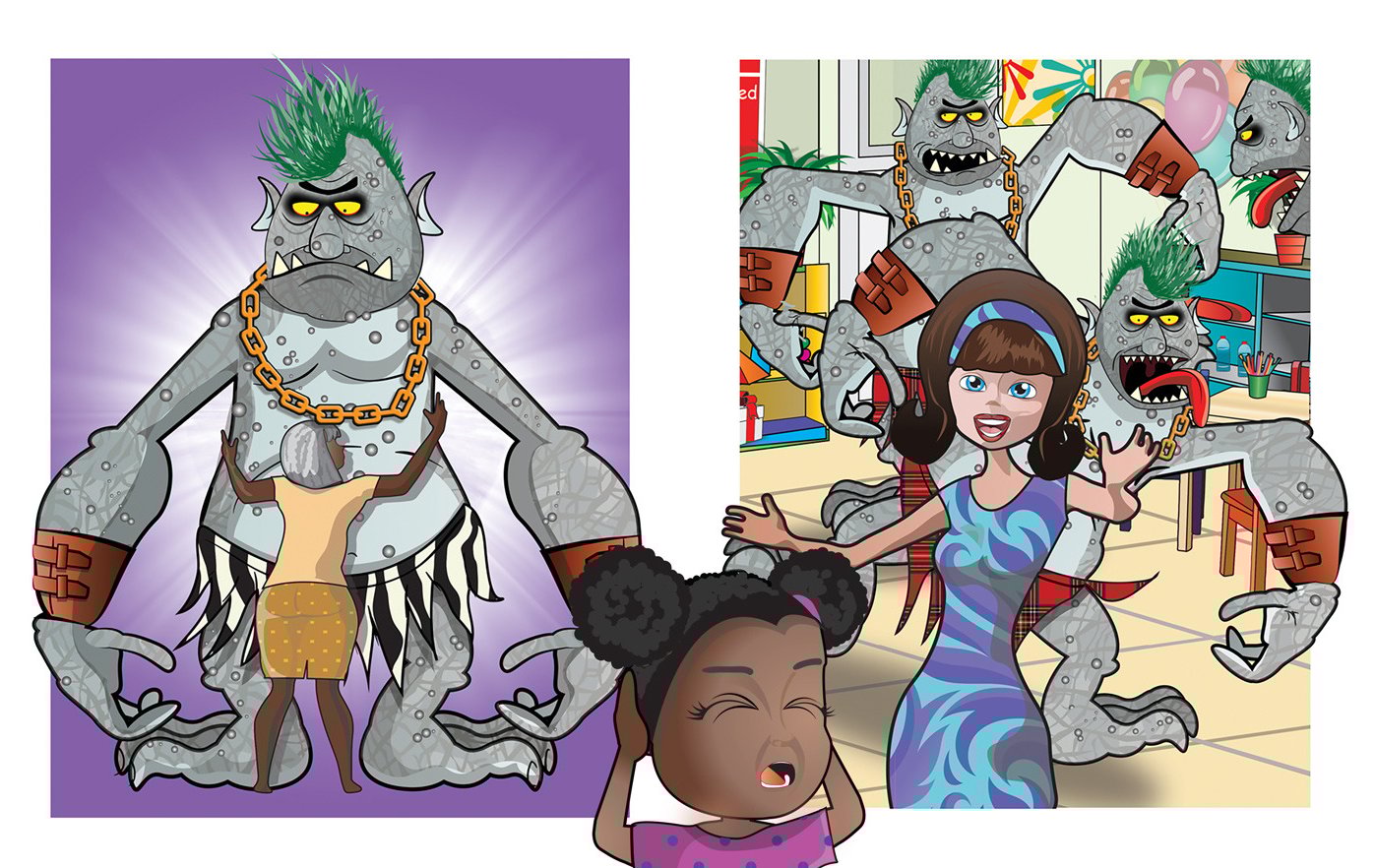 Using my personal vector art style, I crafted expressive and mischievous troll characters that bring humour and energy to the pages. The challenge was finding the perfect balance between making the trolls fun and visually engaging while still reinforcing the book’s message of mindfulness and self-regulation. With the author’s vision and continuous collaboration, I refined the characters, ensuring they complemented the storytelling and resonated with young readers.